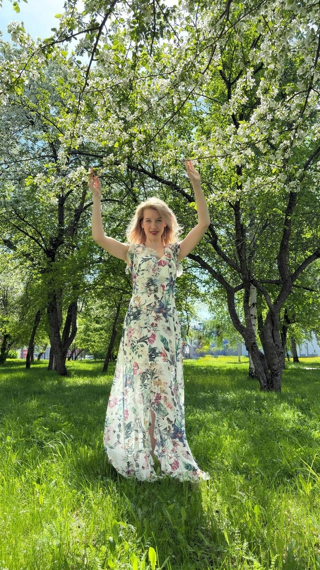 Как же мы сегодня устали 😆 Казалось бы что сложного в фотографировании напротив цветущих яблонь? Но нет, пока мы дошли до места, пока мы его выбрали, я уже успела стереть ноги в красивых туфлях. Дочке пришлось принести мне кроссовки. А я в это время пыталась поймать красивый кадр, и успеть его сделать до того, как штатив сдует ветер. Домой мы пришли уставшие и голодные и подумали, что работа моделей не такая уж и лёгкая и привлекательная, как кажется на первый взгляд 👀 Но я, конечно, очень довольна. Мы быстро собрались и сделали удачный кадры. Когда ты стройная нет проблем выбрать образ, выбрать ракурс. Ты просто фотографируешь все подряд в разных положениях и в разных местах. Желательно, конечно, расслабиться и получать удовольствие, потому что через фото настрой очень хорошо чувствуется. Ну а дальше дело техники 😎