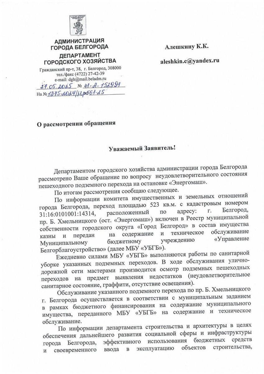 В ответ на пост Пришёл ответ от мэрии насчёт ненадлежащего состояния подземного перехода на остановке "Энергомаш" г. Белгорода. По данным ответа — переход ежедневно убирают и даже проведут капитальный ремонт в текущем году. Буду следить за развитием ситуации.