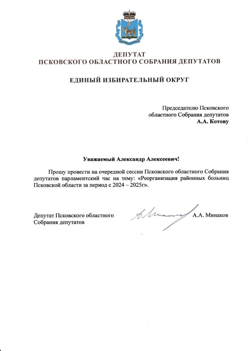 💉 Кризис здравоохранения в Псковской области С прошлого года реорганизовали несколько больниц Псковской области. Власти обещали улучшить работу медучреждений. Но местные жители считают, что реорганизация сократила персонал и ухудшила доступность медицины. На сессии Псковского областного Собрания депутат Антон Минаков (ЛДПР) предложил обсудить реорганизацию районных больниц за 2024–2025 годы. 💬 «После большого количества обращений от местных жителей со многих районов нашего региона мы просто не можем проигнорировать данную проблему! Недавно вопрос реорганизации районных больниц был мною поднят на встрече с Губернатором Псковской области и отмечен Михаилом Ведерниковым как крайне важный. В связи с этим я хочу еще раз обратить внимание коллег из областного Собрания для достижения скорейшего результата в решении данной проблемы», - отметил Антон Минаков.