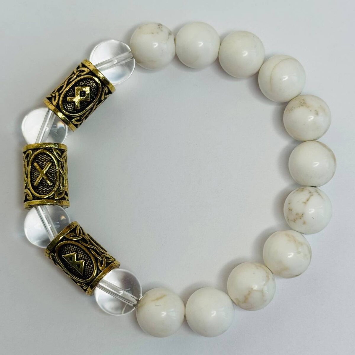 Волшебный браслет из магнезита и горного хрусталя. С рунической формулой: Беркана-Гебо-Отал.🩶