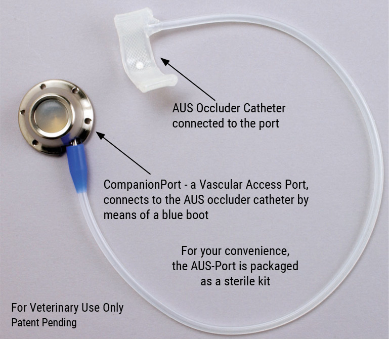 AUS (Artificial Urethral Sphincter) – имплантируемое устройство, которое устанавливается хирургическим путем для контроля непроизвольного мочеиспускания различной этиологии у животных (кошек и собак обоих полов). Установка такого импланта актуальна для пациентов, которым не помогает терапевтическое лечение недержания мочи. На сегодняшний день именно установка AUS является методом выбора при хирургическом лечении недержания мочи у собак. Имплант можно разделить на три части: 2. Подкожный порт выводится на брюшную стенку либо располагается на внутренней части бедра. 3. Магистраль соединяет манжету и порт. С помощью специальной иглы (игла Губера) в порт системы вводится небольшое количество физиологического раствора (~ 0,05-0,1 мл). Через магистраль раствор попадает в манжету, которая увеличивается в объеме, тем самым уменьшая просвет уретры, что в свою очередь приводит к уменьшению струи при мочеиспускании и сдерживанию непроизвольного мочеиспускания. Таким образом, уровень окклюзии (сж