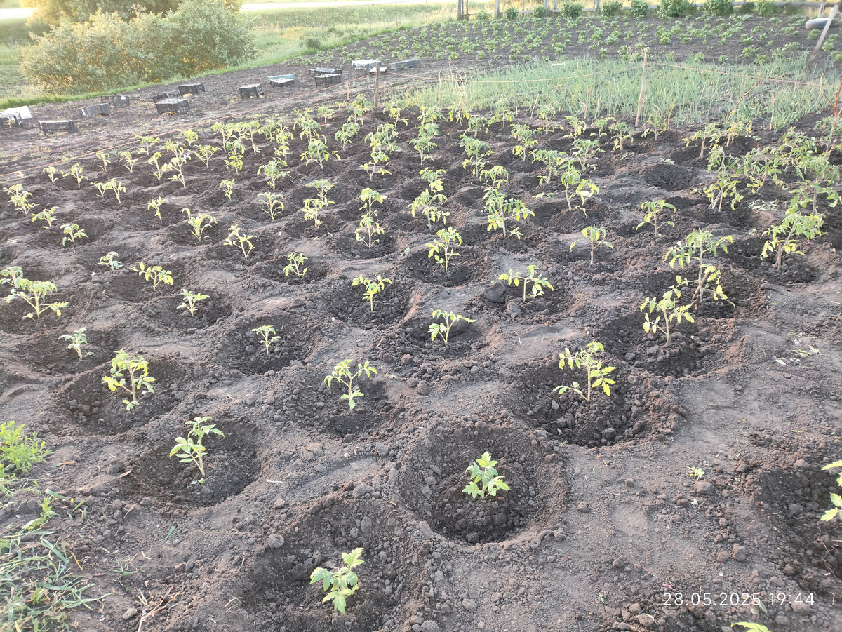 Томатные грядки... Сколько ручного труда и сил они требуют к себе . Но все усилия и усталость компенсируются главным- УРОЖАЕМ! Томат - растение терпеливое и благодарное! Убеждаюсь в этом не первый год! На 28 мая все мои томаты, высаженные в ОГ , благоприятно пережили период акклиматизации и адаптации ( а он был ох каким нелегким!!!) Они набирают силы роста, стебель стал толще, появились первые пасынки. Но сидеть сложа руки не приходится. Сегодня мои томаты дождались внимания и ухода. Они все прорыхлены и окучены! Почему- то среди многих огородников бытует мнение, что до момента бутонизации и цветения томаты требуют частых поливов. Да, влага конечно очень необходима для нормального развития куста томата. Свои томаты в открытом грунте я стараюсь поливать на первых порах в жаркую погоду 2 раза в неделю по 2- 2,5 литра прогретой на солнышке воды на один куст. Но избыток влажности грунта , знай, потянет кучу проблем: это и корневые гнили, и более быстрое распространени