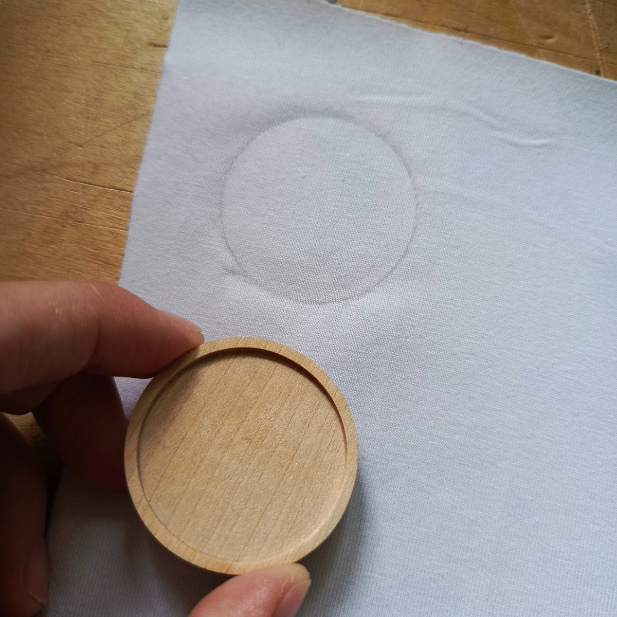 Два дня назад меня накрыла очередная идея фикс. Валяные брошки я уже делала, а почему бы не сделать брошь текстильную, расписав ее акриловыми красками? Два дня я эту идею вынашивала, продумывая варианты исполнения, а сегодня не удержалась и уселась экспериментировать. Для начала нашла деревянную основу и белую кулирку (тонкий трикотаж, из которого шьют футболки). Приложила к ткани основу и обвела карандашом. Далее выкроила с припусками получившуюся деталь. Далее нашла тонкую картонную коробку. Хорошенько её прокатала карандашом, чтобы картон стал плотным. И вырезала кружок по диаметру чуть меньше, чем моя деревянная заготовка. Потом оказалось, что зазор можно было сделать поменьше. Далее прошлась иголкой с ниткой по краю трикотажной детали: Нитку нужно немного стянуть, внутрь детали закладываем немного синтепона (у меня синтепоновые шарики) и закрываем картонкой: Тут нужно подобрать количество синтепона так, чтобы получилось довольно плотная деталь. А дальше стягиваем нитку, чтобы ткан