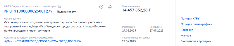 В системе госзакупок появился тендер на оказание услуг по созданию электронных архивов с учетом мест захоронений «Юго-Западного» кладбища Воронежа. Мэрия намерена оплатить инвентаризацию и выделила на эти нужды 14,4 млн рублей. Такова стартовая цена услуги на аукционе. Подрядчику необходимо будет справиться с задачей за 130 календарных дней после заключения контракта. В первые пять дней мэрия передаст исполнителю данные о границах кладбища, план-схему с указанием секторов и 80 регистрационных книг. С этими данными на руках дальше придется действовать самим. На первом этапе требуется отсканировать те самые книги, собрать данные со всех надгробий (в том числе бесхозных), пронумеровать их, замерить все оградки и установить GPS-координаты каждого захоронения. Все могилы нужно сфотографировать два раза (крупный план памятника и общий план с оградкой). На втором этапе необходимо провести топографическую аэрофотосъемку с беспилотника в масштабе 1:500, сверить фактические и кадастровые границы