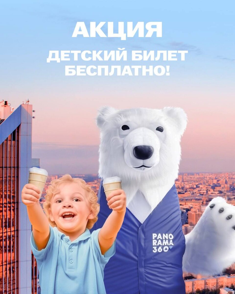 Бесплатный детский билет в PANORAMA360 1 июня Еще одна классная акция в подборку к 1 июня. В это праздничное воскресенье всем малышам до 5 лет вход в PANORAMA360 бесплатный! На высоте 327 метров вас ждёт безлимитная дегустация мороженого и шоколада с самых высоких фабрик мира и яркая анимация с белым мишкой Панорамычем 🎈 Время пребывания на площадке не ограничено. 🗓 Праздничная программа: 11:30–12:00 — Мастер-класс «Браслетики своими руками» 14:00–15:00 — Творческая студия «Муха Мьюзик» 15:00–15:30 — Весёлые старты с Панорамычем 16:30–17:00 — Бумажная вечеринка рокеров 18:30–19:00 — Праздничное крио-шоу с Зеркалиусом 20:00–20:30 — Прогулка с пикселями на 89 этаже 🎁 А ещё всех детей до 14 лет ждут подарки при входе в PANORAMA360 на минус втором этаже! Обычная стоимость билетов в Panorama: взрослый - 2750₽, детский - от 500₽. Площадку также добавили в программу бонусов РуссПасса, и если у вас есть бонусы, то можно взять билеты и сюда за 10₽. Также билеты сюда можно приобрести