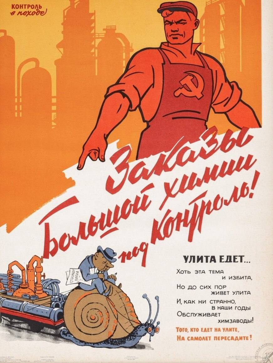 Мы продолжаем наши экскурсы в историю советского химического агитационного плаката. Как мы уже писали, 1960-е годы - это годы пристального внимания к химической промышленности и большим химическим стройкам. А там, где планы, пятилетку в четыре года и большие стройки - там всегда нужен контроль. Сегодня в коллекции нашего музея - произведение, увидевшее свет в 1964 году. Автор плаката «Заказы большой химии - под контроль» - советский график Вениамин Брискин (1906-1982), работавший в «Крокодиле» и в Окнах ТАСС. Плакат посвящен слишком медленному выполнению заказов для строительства больших химзаводов, о чем повествует стих «Улита едет…»: Хоть эта тема и избита, Но до сих пор живет улита. И, как ни странно, в наши годы, Обслуживает химзаводы! Того, кто едет на улите, На самолет пересадите! #химиянаплакате Материал подготовлен ИОНХ РАН для проекта «Виртуальный музей химии: продолжение осмотра» при грантовой поддержке Минобрнауки России в рамках федерального проекта «Популяризация науки и