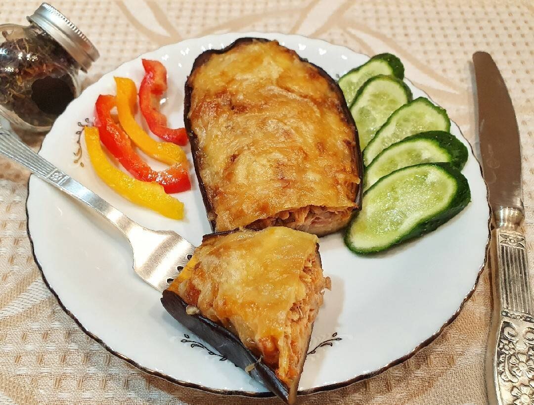 Этот рецепт для любителей баклажанов. Готовить его легко и просто. Тунец придает блюду особенную изюминку. Такие баклажаны прекрасно подойдут для праздничного стола, ваши гости будут довольны. Это блюдо можно подать как в теплом, так и в холодном виде. Ингредиенты: - баклажаны 2 шт - тунец консервированный 1 банка - лук 1 головка - сыр твердый 150 гр - сливочное масло 20 гр - томатная паста 2 ст.л - масло растительное 1 ст.л - соль, перец по вкусу Приготовление: Подготовить необходимые продукты. Начинаем с баклажанов. Хорошо вымыть, обсушить, разрезаем на две равные доли, и удаляем мякоть с помощью столовой ложки. Баклажаны кладём на противень, и отправляем в духовку, разогретую до 180 градусов, на 15 минут. В это время начинаем готовить начинку. Лук почистить, порезать мелкими кубиками. Берём сковороду смазанную сливочным маслом и выкладываем лук, обжариваем 5 минут. К луку добавить мякоть баклажана, и обжариваем ещё 5 -7 минут. Добавляем к овощам томатную пасту, все хорошо пер