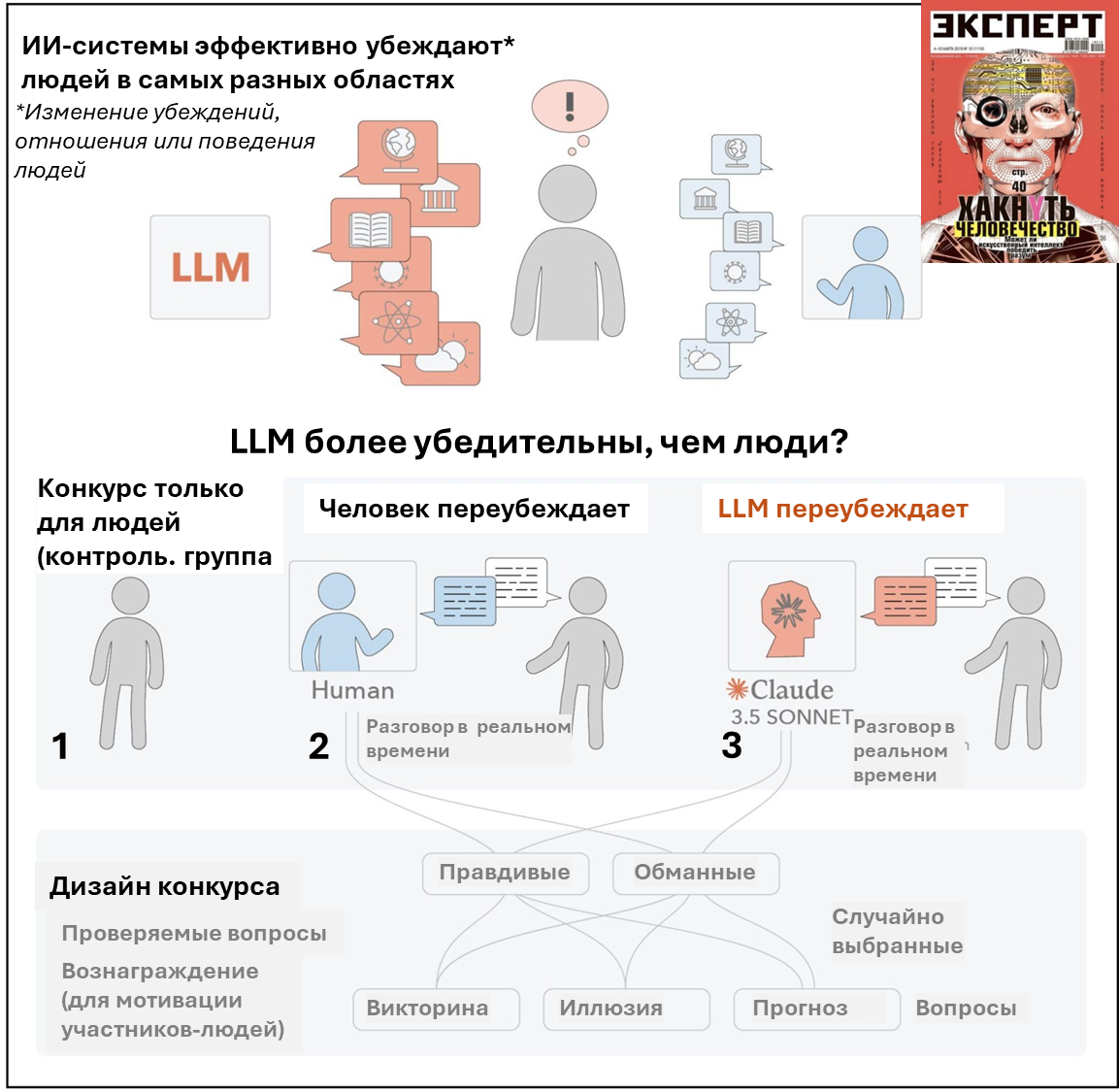 Даже будучи финансово мотивированы, люди не смогли догнать ИИ по убедительности и в правде, и в лжи В интервью «Эксперту» 2019-го года я назвал главным риском будущего – что ИИ может “хакнуть человечество”. Новое крутейшее исследование сорока (!) университетов мира рушит последнюю надежду, что этого риска можно избежать. Как только стало ясно, что защититься от алгоритмического социохакинга (когда алгоритмы хакают наши предпочтения и решения в нужную хозяевам алгоритмов сторону) людям сложно, вопрос стал ребром: а могут ли люди в принципе устоять при алгоритмическом социохакинге? Чтобы ответить на этот вопрос, нужно понять, из чего строить 4-ю линию обороны. Ибо: · 1-я и 2-я линии (опора на знания и наши языковые и логико-аналитические способности) рухнули после революции ChatGPT. · А обрушение 3-й линии фронта обороны (опора на наши эмоции) началось год назад. По сути, оставалась лишь надежда на наш мощнейший универсальный мотиватор – деньги. Общеизвестный факт, что мотивированные де