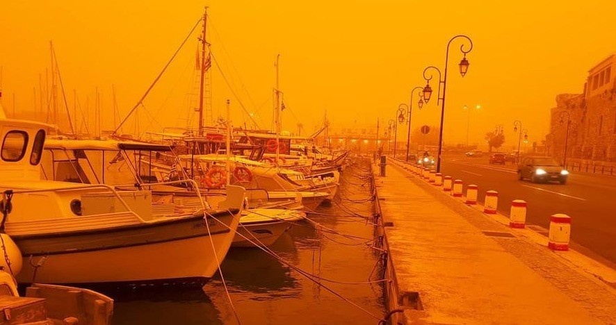 Жара, пыль, ветер набросились на самый южный европейский остров Крит в минувшее воскресенье (25 мая). С утра сильные южные ветры не давали приземлиться самолетам в городах Ираклионе и Ханье. Их перенаправляли в аэропорты Афин и острова Кос. При этом в аэропорту Ираклиона скопилось немало пассажиров, ожидающих вылета. Во второй половине дня ветер стих, но пришла новая напасть – африканская пыль. Этот «подарок» от Африки-соседки время от времени накрывает Крит, и голубое высокое небушко становится желто-оранжевым. Мало того что пейзажи вокруг становятся «марсианскими» – дышать тяжело, особенно в городах, ухудшается видимость на дорогах, так что фонари на улицах иногда включаются даже днем. Пыль проникает в здания: сегодня в муниципалитете Фест закрыты школы. По критским СМИ гуляет фото автобуса, прибывшего в Ираклион из Херсониссоса. Слой пыли на нем таков, что кажется, он пересек пустыню Сахара. В Ираклионе запылились даже веб-камеры – стоит только взглянуть на онлайн-видео. Но критяне