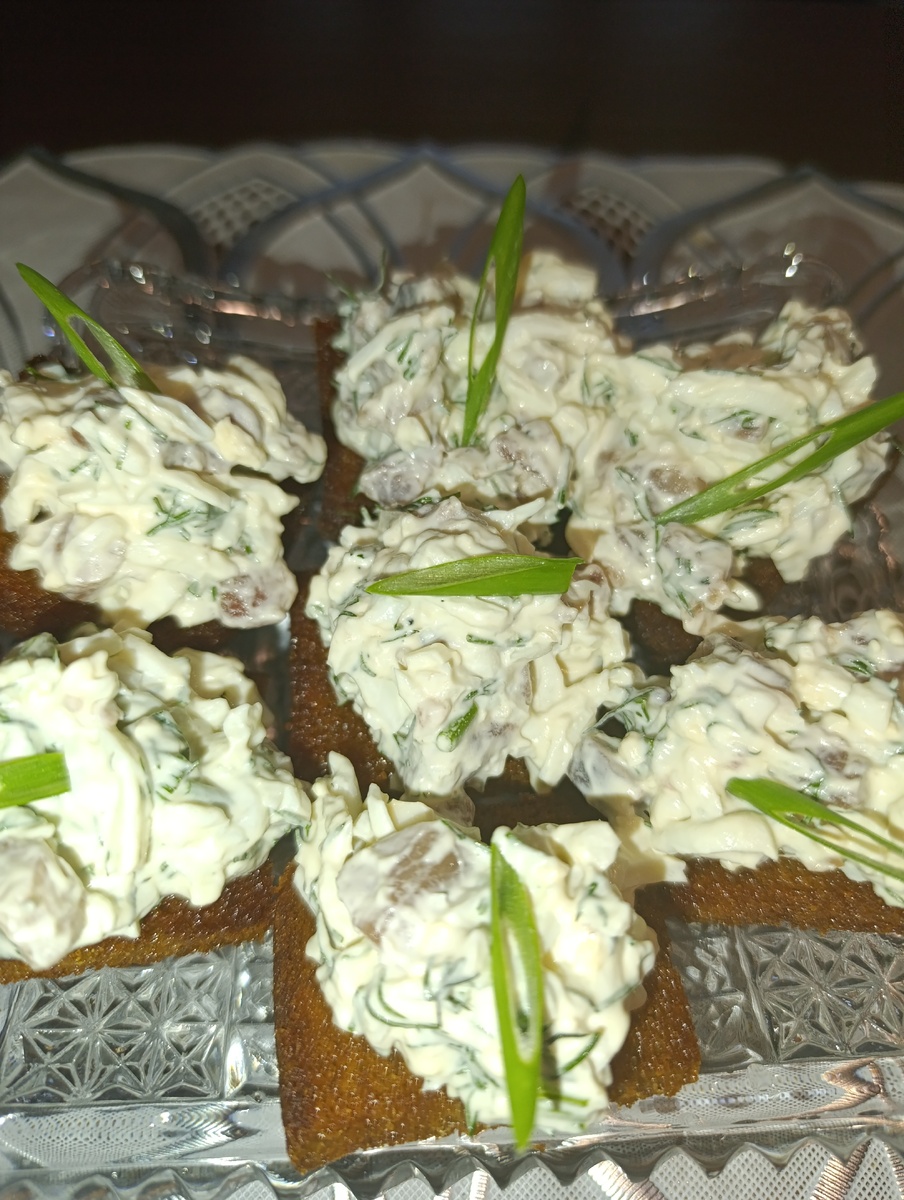 Ингредиенты: хлеб - 4 квадратных кусочка сельдь - 1 шт яйцо 2 шт укроп 4-5 веточек майонез по вкусу Сельдь очищаем, отделяем от косточек и мелко нарезаем. Яйца натираем на терку и добавляем к сельди. Добавить майонез и перемешать. Нарезаем укроп и добавляем к сельди и яйцам. Перемешиваем. Каждый кусочек хлеба разрезаем на 4 квадратика и обжариваем. Выкладываем на гренки нашу сельдь с яйцом и укропом. Приятного аппетита!!!!