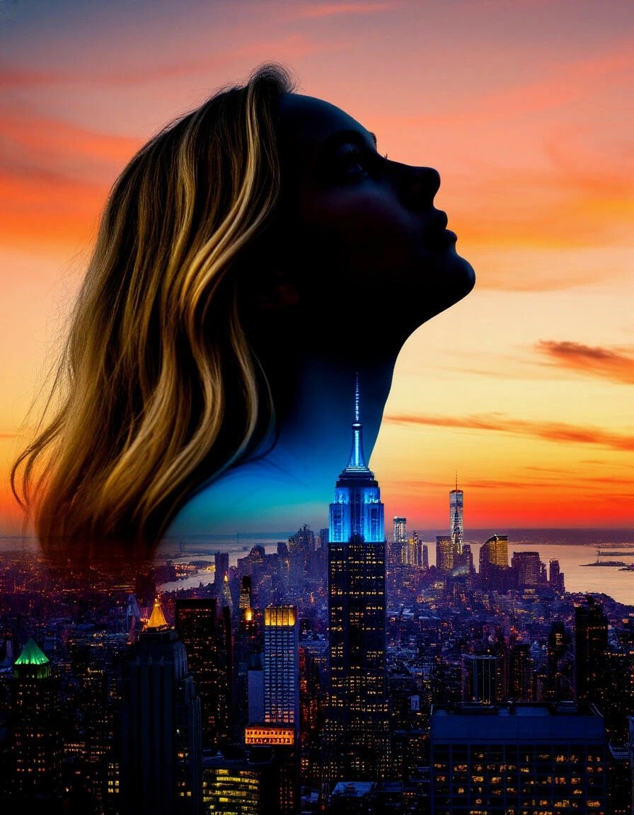 Double exposure portrait. Silhouette of a young woman, head tilted back, gazing upwards with an ethereal expres sion, her blonde hair catching a cool blue light. The lower part of her silhouette (torso) is filled with a vibrant New York City skyline at dusk or night, featuring the illuminated Empire State Building and countless glowing city lights under a warm orange and red sunset sky. The external background is a plain, bright off-white. Dreamy, aspirational, and luminous. Photorealistic details. #neuroart #нейроарт #ai #ии #нейросеть #картинки #искусственныйинтеллект #цифровоеискусство #digitalart #арт #art #prompt #промпт #подсказка