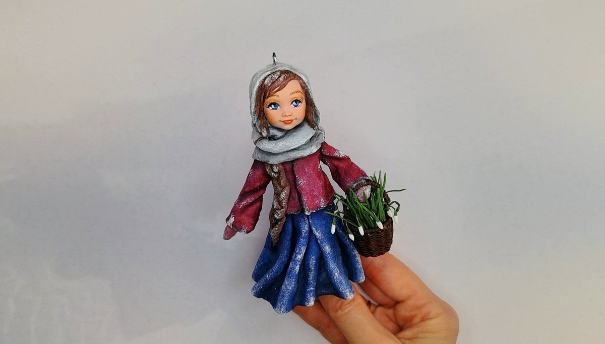 После того, как куколка высохла, выравняю ей голову, сделаю варежки и курточку.