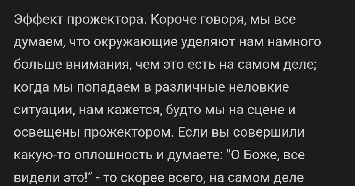 Многие люди сталкиваются с ощущением, что за ними постоянно наблюдают, оценивают, анализируют каждое их движение и слово. Это явление в психологии называется эффектом прожектора (англ. spotlight effect). Название метафорично: человек ощущает себя как будто на сцене под ярким светом прожектора, в центре внимания.