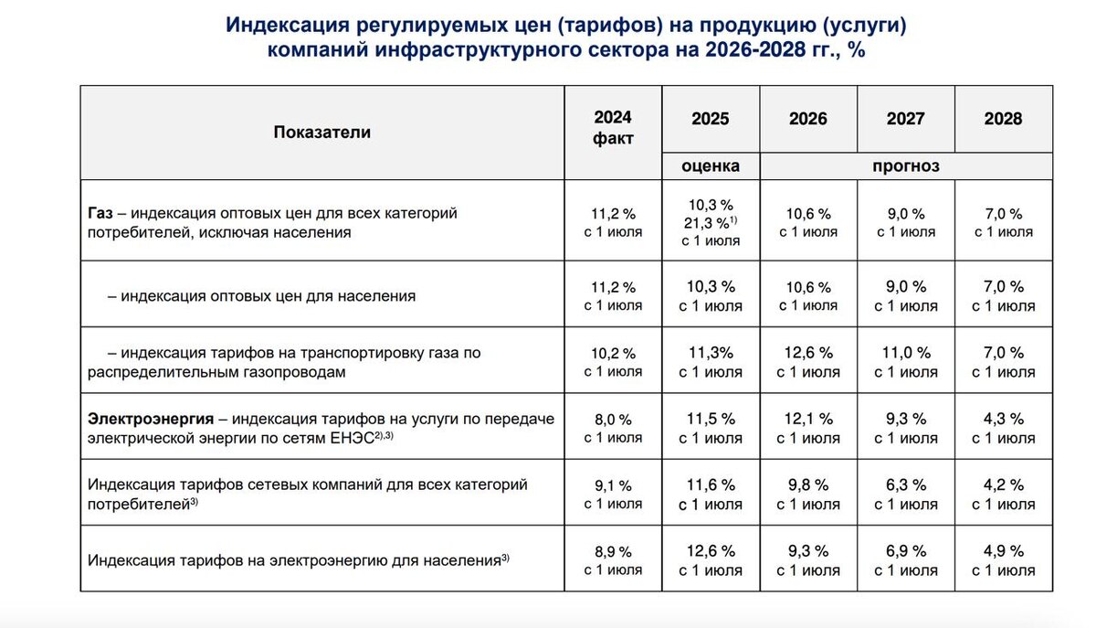 Кстати про рост цен. Опубликовано Минэкономразвития почти месяц назад. .... прогнозируемые изменения цен (тарифов) на товары, услуги хозяйствующих субъектов, осуществляющих регулируемые виды деятельности в инфраструктурном секторе, на 2026 год и на плановый период 2027 и 2028 годов