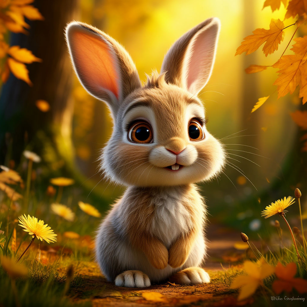 В залитом солнцем лесу, где золотые листья танцевали на ветру, жил крошечный кролик по имени Баттон.