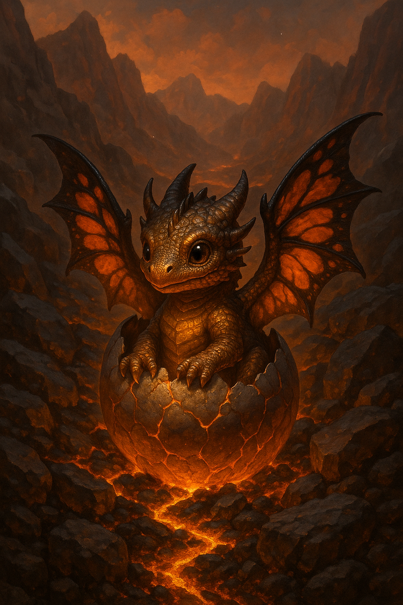 Жил-был в высоких скалах у подножия Огненного хребта бронзовый дракончик по имени Зиран. Он был совсем маленьким — с ладошку, но уже носил на себе блестящую чешую цвета закатного солнца. Его крылышки были особенные: тонкие, как лепестки, они переливались оранжевыми и черными узорами, словно языки пламени танцевали на ветру. Зиран родился в гнезде из вулканического камня, вместе с тремя другими драконятами. Его мама, мудрая дракониха Мелария, охраняла гнездо от хищников и от холодных ветров, ду́вших с северных гор. Она часто уносилась в небо, добывать еду, а драконята в это время учились ползать и махать крыльями. Однажды, когда над горами разразилась буря, Зиран решил выбраться за край гнезда. Ветер подхватил его, и маленького дракончика унесло далеко-далеко — через леса, реки и поля. Он упал в старую рощу, где деревья были выше башен и листья шептали на древнем языке. Зиран не знал, где он, и громко пищал, надеясь, что мама услышит. Но вместо Меларии, его услышала девочка по имени Лин