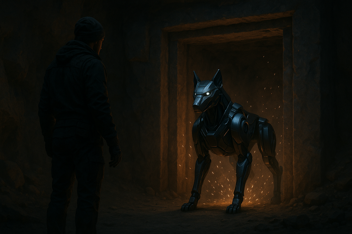 Взявшись за малозаметный край валуна, я не без труда перевернул его, открывая небольшое углубление в каменном полу, ставшее укрытием для моего устройства, из-за которого в своё время возникло немало проблем. Раскрыв тряпьё, скрывавшее мой клад, я улыбнулся, когда увидел холодный блеск металла и прикоснулся к его поверхности. В углублении каменной породы, свернувшись в кольцо, лежало нечто, похожее на собаку, однако сходство было только внешнее - по факту это был неживой механизм, лишь отдаленно копирующий анатомические особенности собакообразного существа. Проведя рукой по гладкому корпусу, я нашёл необходимую перемычку и активировал устройство.