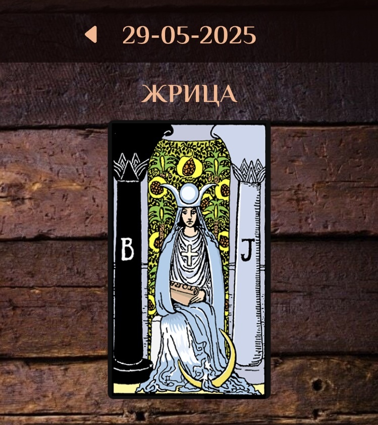 Верховная Жрица олицетворяет мудрость женского существа в мистическом, магическом и метафизическом смысле (Императрица, в противоположность этому – в бытовом, чувственном и эмоциональном). Это способность видеть насквозь, читать мысли и угадывать прошлое и будущее. Это вечная женщина-богиня древнего мира, несущая знание и духовную мудрость и как минимум равная мужчине.