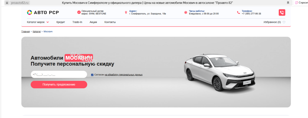 Авто РСР — это автосалон в Симферополе. Мы сомневаемся в том, что он существует физически, вероятнее всего, это сайт для сбора заявок. Указанные владельцы «засвечены» на сайтах салонов из черного списка, а также в делах о защите прав потребителей. По адресу ул.Бородина 18в в Симферополе на картах отмечен автосалон Автопрестиж, который теперь называется Аврора — как и все салоны по России, которые, возможно, входят в одну сеть. Поэтому мы сомневаемся, что Авто РСР — реальный дилер, скорее всего это лидген. Сайт создан по шаблону, который используется дилером AG Krasnodar — он в нашем черном списке. Даже каталог не заменили, что сразу говорит о том, что на ресурсе нет достоверной информации о наличии транспортных средств. В подставном дилерском центре продаются китайские автомобили и Москвич. Цены сильно снижены. Например, рыночная стоимость Москвича 3 от 1 700 000, а в каталоге ценник ниже почти на половину. При этом публичной оферты нет, правила акции отсутствуют. В качестве владельцев