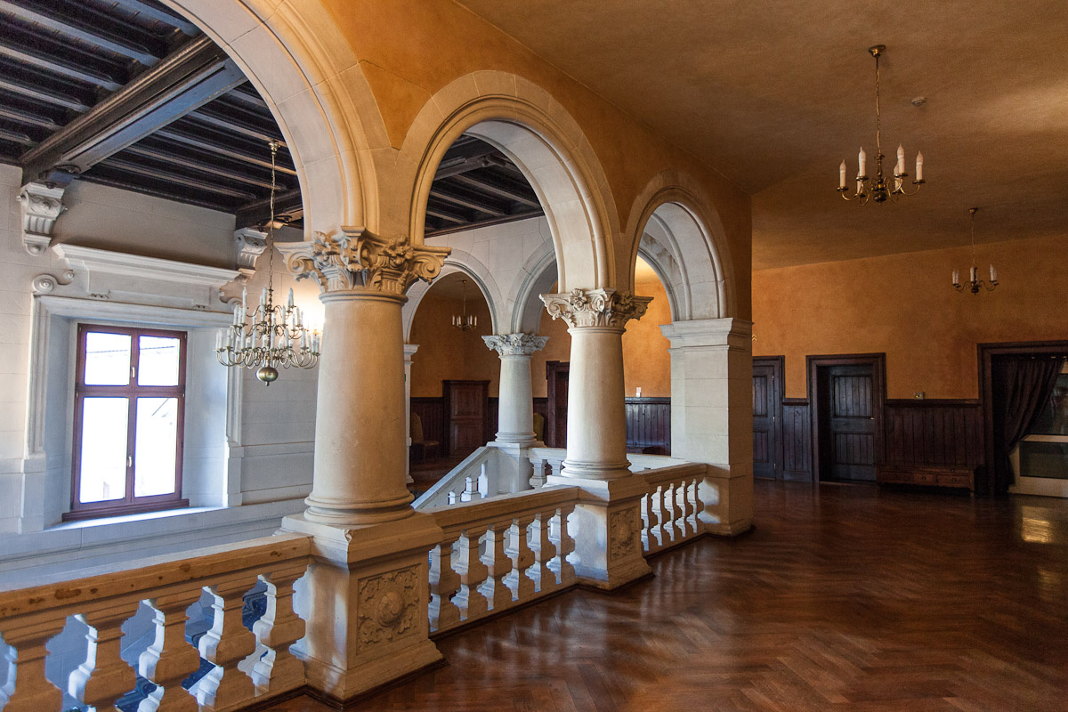 Наибольшее влияние на облик замка оказали одновременно готический и ренессансный стили. Готические элементы прочитываются в арках дверей и окон, в узорчатых витражах, которые придают яркость, играющую в солнечные дни. В то время как ренессансный стиль проявляется в симметричных формах, гармонии пространств и изысканных кессонных потолках. Эти два стиля неразрывно связаны, создавая цельную эстетическую картину, которая поражает своей сложностью и красотой.