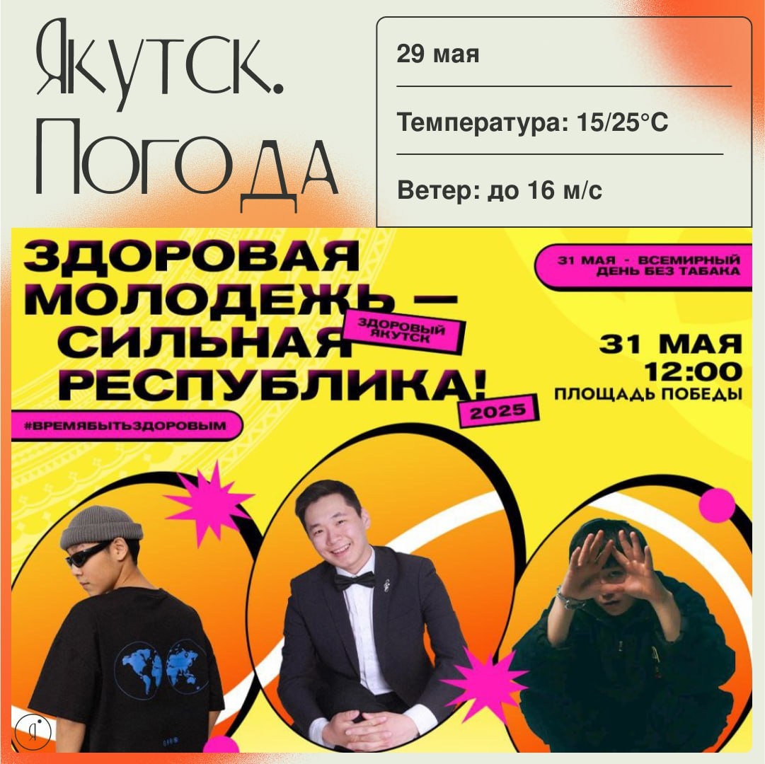 С добрым утром! Якутяне отметят День без табака 31 мая с 12:00 на площади Победы пройдет акция «Здоровая молодежь – сильная республика». В рамках акции: 🔶 Фитнес-разминка с чемпионом; 🔶 Выступление звезд эстрады и танцевальных коллективов г.Якутска; 🔶 Итоги конкурсов по ЗОЖ; 🔶 Бесплатный чек-ап здоровья; 🔶 Интерактивные площадки, творческие мастер-классы по первой помощи, авторским настольным играм, шашкам, кроссбукинг, площадка здоровья. Online Якутия | Подписаться
