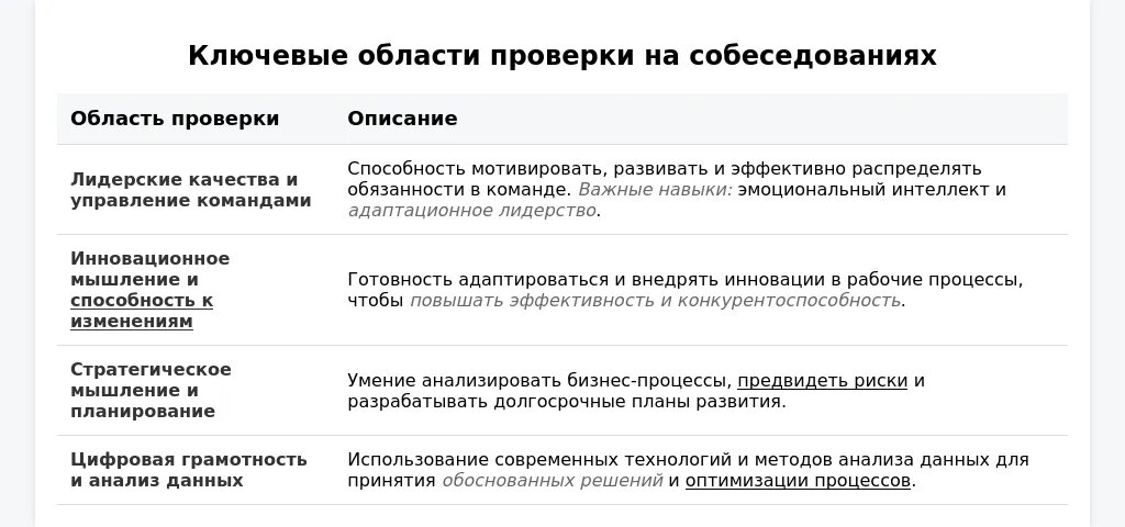 - Попросите рассказать о себе и опыте.✅ «У меня 10 лет опыта в управлении командой из 20 человек, что позволило увеличить показатели производительности на 25% в течение трех лет».❌ «Всю жизнь работал в управлении. Думаю, справлюсь».