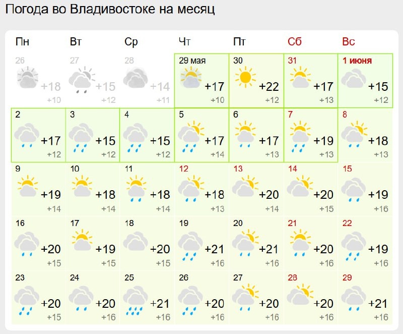 📌📌📌 Готовы к лету? По данным «Гисметео», первая неделя лета во Владивостоке пройдет в дожде при средней температуре +15 °С. Несколько дней город ждет просветление и потепление до 19 градусов, но в конце месяца снова осадки, термометры покажут +2 градуса тепла, но ощущаться будет как +15…+16 °С. 🟥Подписаться | Предложить новость