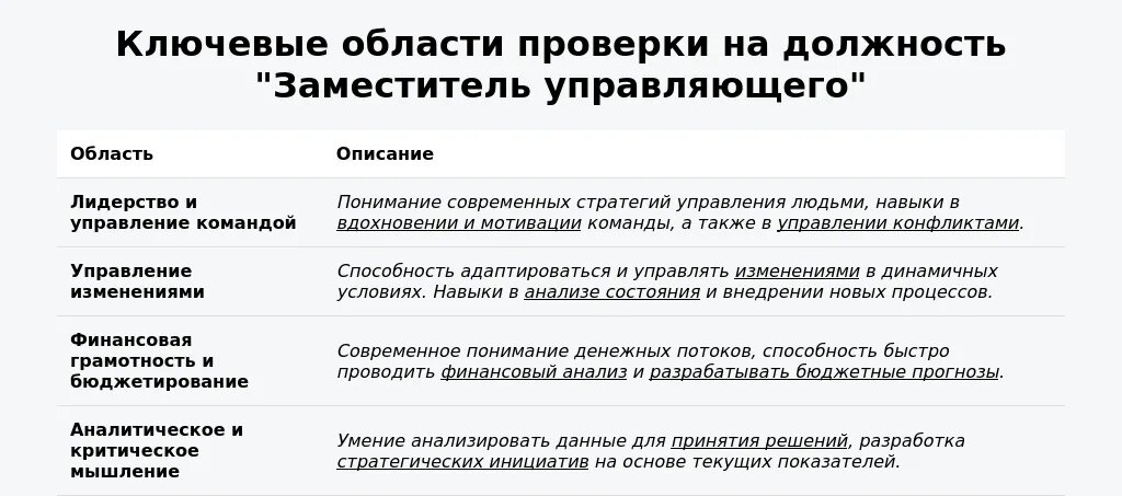 Специфические требования для заместителя управляющего могут включать опыт управления проектами и знания специфики отрасли.