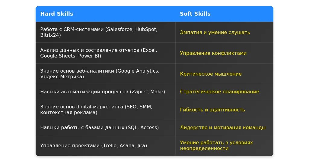 После адаптации: "Знание CRM-систем, работа с Excel, ведение переговоров, анализ данных."