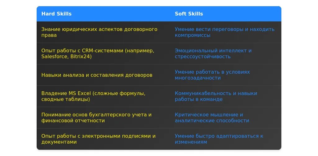 Навыки должны быть перегруппированы так, чтобы соответствовать вакансии. Например, если вакансия требует знание Excel и CRM-систем, эти навыки должны быть на первом месте. Используйте ключевые слова из вакансии, такие как "ведение переговоров", "работа с договорами", "знание законодательства".