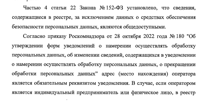 Похоже, возмущение предпринимателей о том, что часть персональных данных оказываются в публичном доступе (адреса, телефоны, e-mail) достигло своего апогея: в Думе решили дополнить 152-ФЗ и появился законопроект, который вносит поправки в 22 статью. Ссылка на законопроект https://sozd.duma.gov.ru/bill/928282-8 Скриншот из пояснительной записки: Как всегда, выпустили сырой закон в ноябре 2024, затем ИП начали возмущаться, но их данные уже оказались в публичном доступе. И только в мае, когда все поголовно повалили сайт РКН на лопатки уведомлениям - 28 мая 2025 решили дополнить 152-ФЗ. Спохватились спустя 6 месяцев! Надеемся, что реализуют скоро и без ущерба действующей кривой форме Уведомления. И наши данные скроют уже из публичного доступа. Многие ИП даже решили уточнить данные в реестре, намеренно скрыв адрес после того как увидели, что он там появился. Я не против давать адрес регистрации, но только тем, с кем заключаю договор, а не для любого "сотрудника службы безопасности", у кот