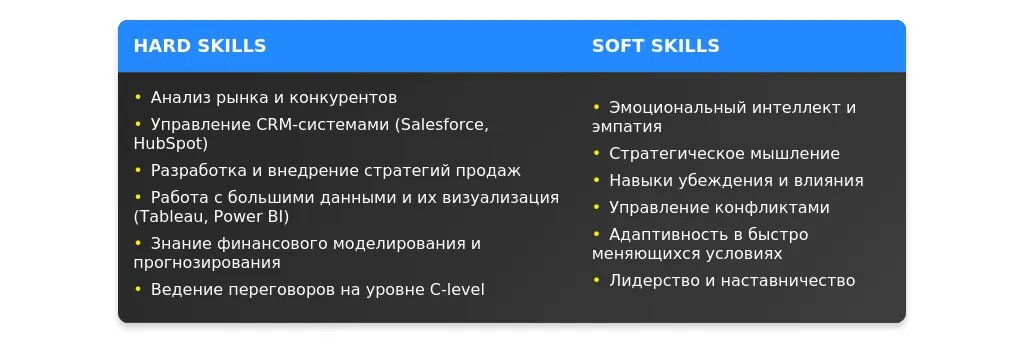 Вакансия 3: "Знание продукта и рынка B2B, опыт ведения переговоров на уровне топ-менеджмента". Здесь акцент на B2B и переговоры — обязательные требования, а уровень топ-менеджмента — скрытое требование к коммуникативным навыкам.