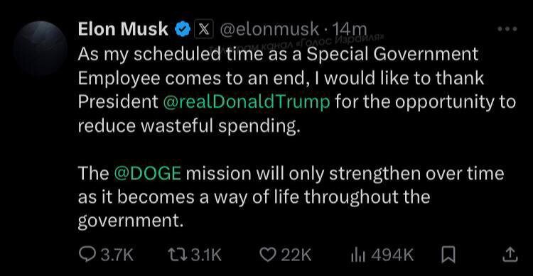 «По мере завершения моей работы в качестве спецгосслужащего, благодарю президента Трампа за возможность сократить неэффективные расходы. Миссия DOGE со временем только укрепит экономику, поскольку станет образом жизни всего государства».