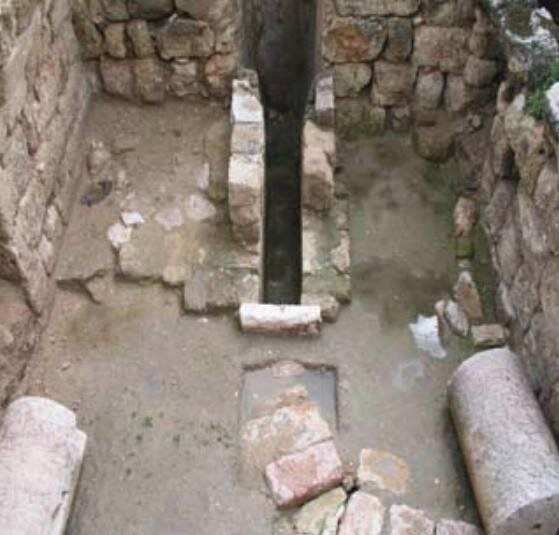 В 2000 году этим местом вновь заинтересовались археологи. Что за устройство располагалось когда-то в помещении? На высоте четырёх метров здесь находилась цистерна, питаемая, по-видимому, главным городским акведуком, а из цистерны вода должна была попадать на водяное колесо. От самого колеса ничего не осталось, однако на опорах сохранились квадратные отверстия от колёсного вала. Кроме того, на одной из опор есть круговые следы, оставленные неким вращающимся объектом. Судя по этим следам, крутившееся устройство в процессе работы перемещали на 14 см в вертикальной плоскости. По-видимому, с каждой стороны от водяного колеса на валу находились некие диски (вероятно, деревянные, скреплённые гвоздями) диаметром не менее 1 м — они и оставили следы на опорах. Сохранился желоб, подававший воду на колесо, а также канал на полу, отводивший воду из помещения. Судя по косвенным признакам, само колесо было около полуметра в ширину и 4,5—5 м в диаметре. Что же здесь находилось? Водяная мельница? Но никаких частей каменного жернова найти не удалось. Кроме того, остатки конструкции не походили на известные мельничные устройства.