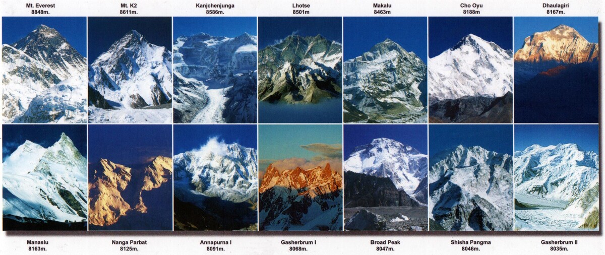 - 10 вершин расположены в Гималаях (Непал, Китай, Индия, Пакистан).