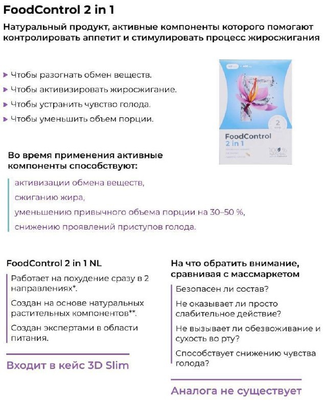 🟢 *Шаг 2. FoodControl 2 in 1* *Капсулы «Утро»* Благодаря активным компонентам капсулы «Утро» организм учится получать энергию из своих жировых запасов, а значит хотеть есть вы будете намного реже и наедаться сможете меньшим количеством пищи. ✔️Белый и зеленый чаи, зеленый кофе активизируют обмен веществ. ✔️L-тирозин — аминокислота, под действием которой повышается расход жиров организмом, а также увеличивается количество кислорода в крови, что также способствует жиросжиганию🔥 ✔️Кайенский перец, имбирь, витамин PP, пиколинат хрома и черный перец атакуют 🏹жировые отложения в проблемных местах, стимулируя их сжигание. *Капсулы «Вечер»* ✔️Содержат L-триптофан и гриффонию, которые повышают качество сна, способствуют выработке серотонина — гормона радости. В обычной жизни многие люди получают этот гормон, «наградив» себя всего одной конфеткой с чаем 🤦🏼♀️ ✔️Экстракт гарцинии камбоджийской блокирует аппетит и помогает выдержать снижение калорийности рациона. *Таким образом ка