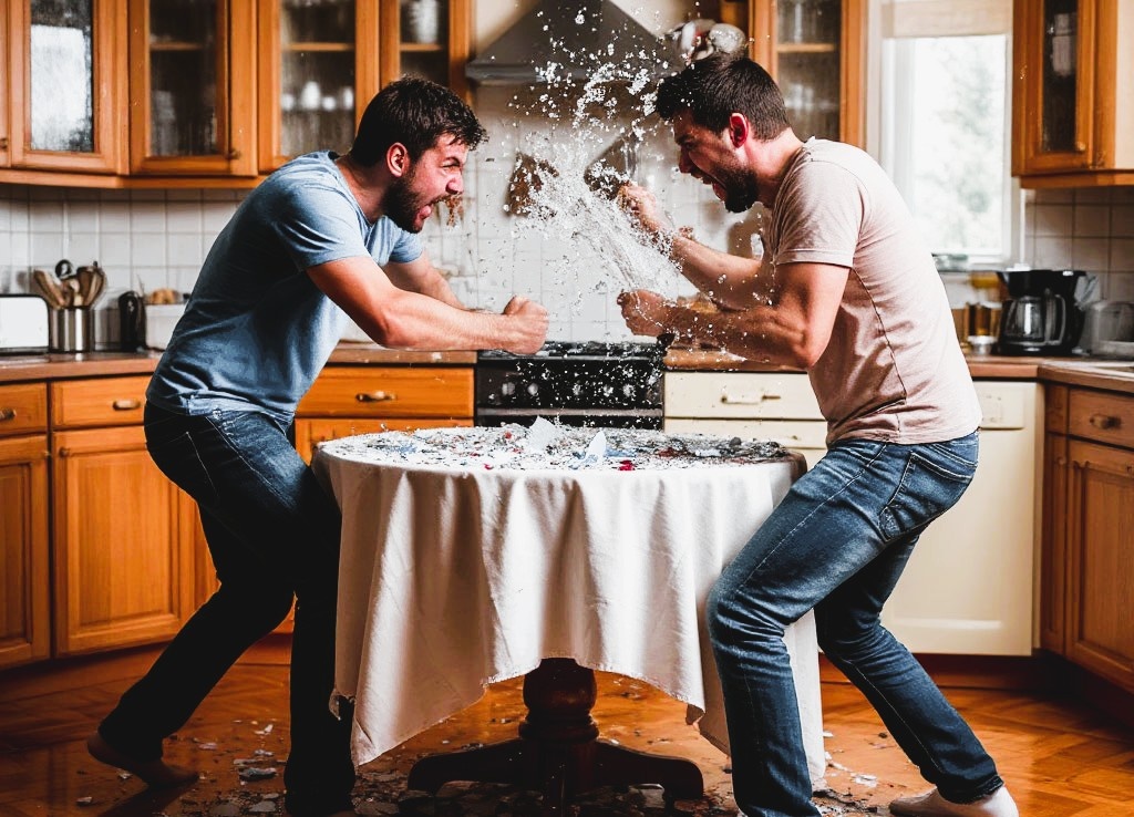 Внезапным, неконтролируемым движением он рванул со стола скатерть. Фарфоровые тарелки, хрустальные бокалы, элегантная ваза – всё полетело на пол с оглушительным грохотом, рассыпаясь на тысячи осколков. Его охватила ярость, слепая и безудержная. Он толчком оттолкнул Славу, который, потеряв равновесие, инстинктивно схватился за кухонный кран, чтобы удержаться. Раздался резкий металлический скрежет – кран оторвался от раковины и из него с силой брызнула вода, заливая всё вокруг.