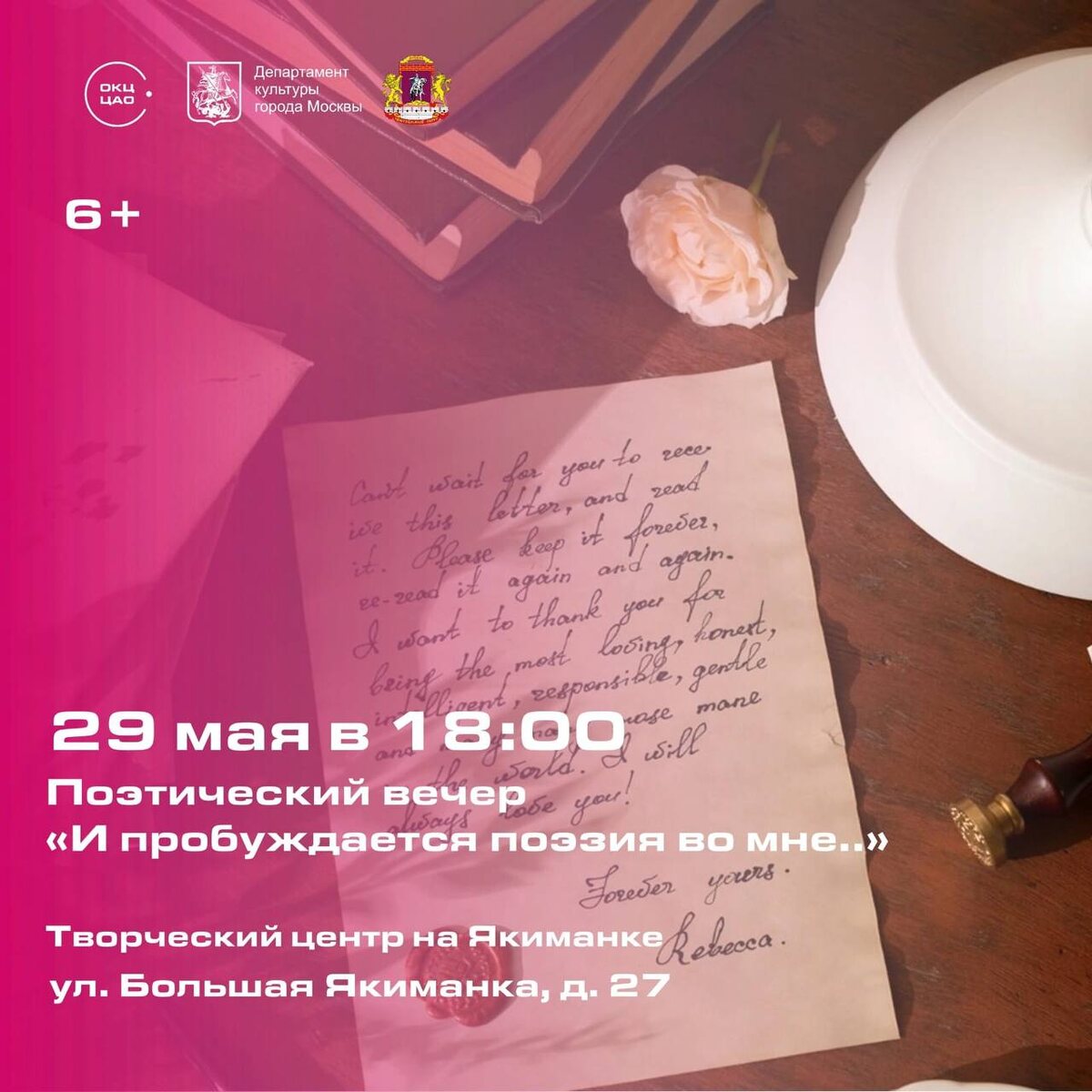 Приглашаем в Творческий центр на Якиманке на поэтический вечер "И пробуждается поэзия во мне...".📖