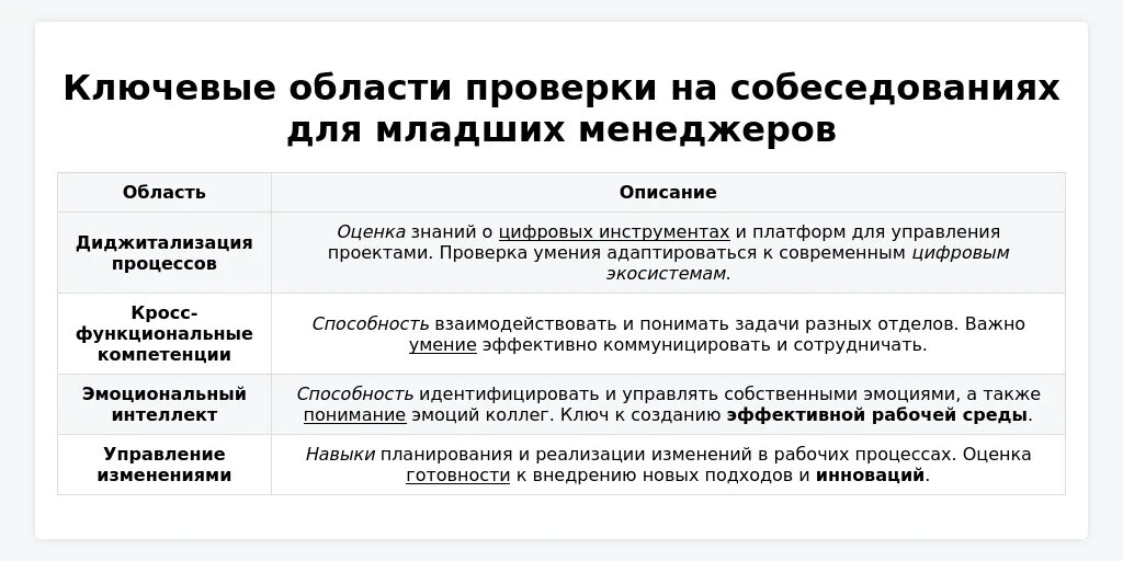 В 2025 году процесс найма младших менеджеров претерпел изменения из-за новых требований к soft skills и инновационных методов оценки кандидатов. Основные компетенции, которые оценивают работодатели, включают: