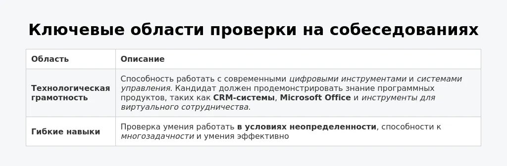 На этапе общения с HR следует подготовиться к более интенсивной оценке ваших социальных навыков. Коммуникация, стрессоустойчивость и командное взаимодействие — вот основные аспекты, которые будут рассмотрены.