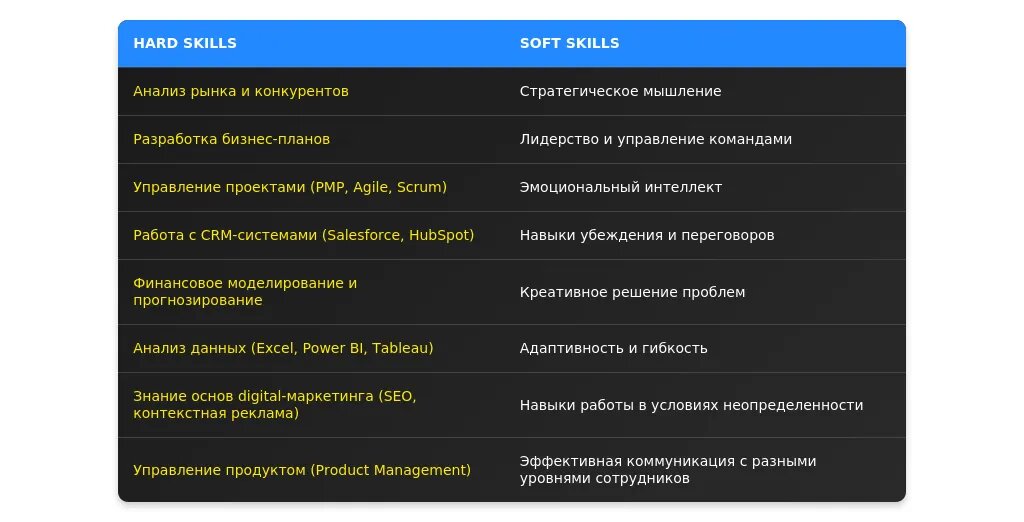 После адаптации: "Управление проектами, работа с CRM-системами, аналитика данных, знание английского языка (Upper-Intermediate)."