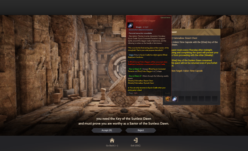 Завершив Йорунакию, таким же образом, вы получите в награду кинжал, который позволит вам вернуться в зону финального босса Ваамакии, который вы сможете использовать в еженедельном задании.