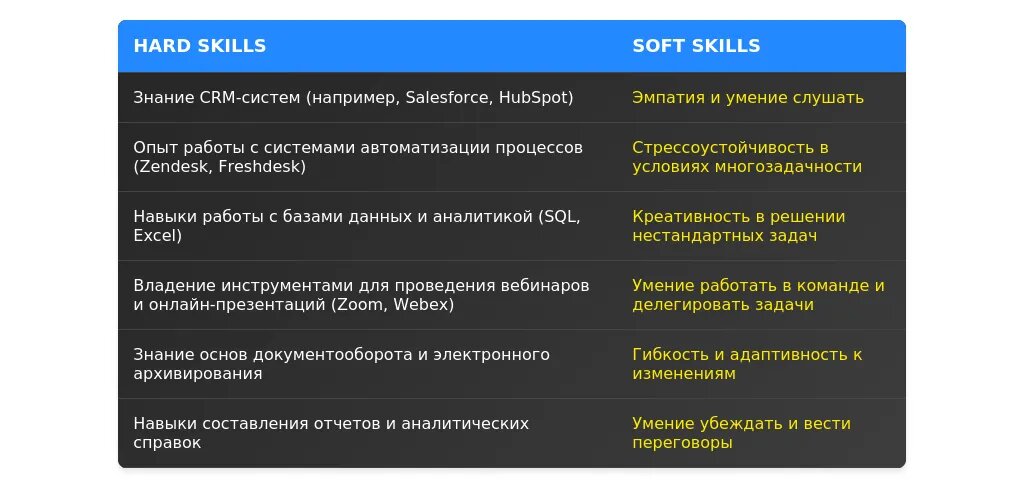 - Анализ данных клиентов — навыки интерпретации данных для улучшения обслуживания.