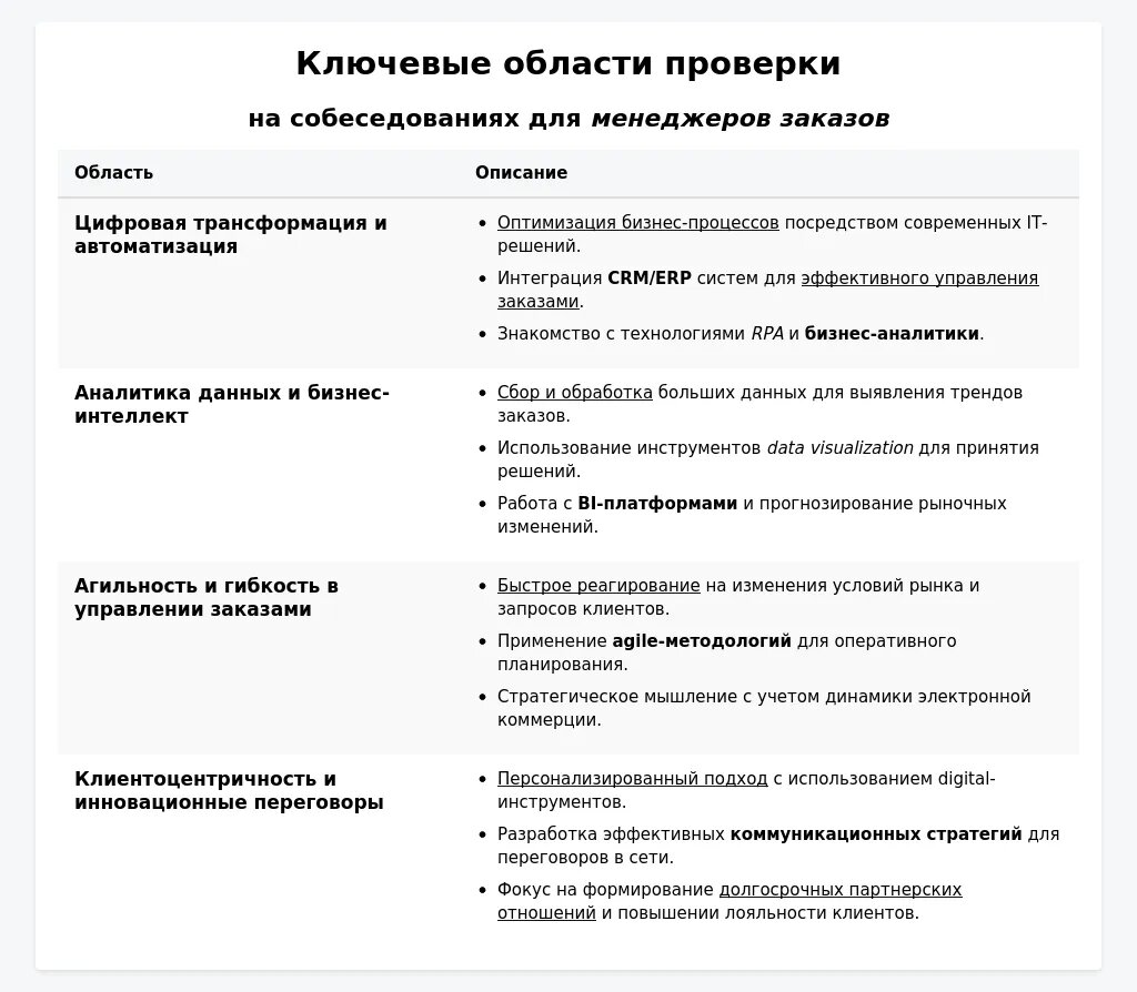 Современный процесс найма для менеджеров заказа ориентирован на проверку коммуникативных навыков и других soft skills. Работодатели акцентируют внимание на следующих ключевых компетенциях: