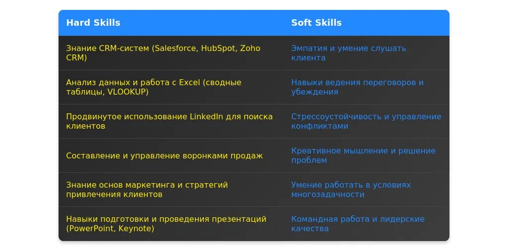 Навыки должны быть перегруппированы под требования вакансии. Выделите ключевые компетенции, такие как "работа с CRM-системами", "ведение переговоров" или "анализ данных". Используйте ключевые слова из описания вакансии, чтобы резюме прошло автоматическую проверку системой ATS.