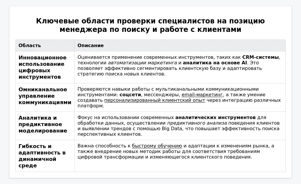 В современном рынке труда процесс найма на позицию менеджера по поиску и работе с клиентами становится всё более тщательным. Работодатели уделяют внимание коммуникативным навыкам, которые являются залогом успешного взаимодействия с клиентами. Ключевые компетенции, оцениваемые работодателями, включают следующие: