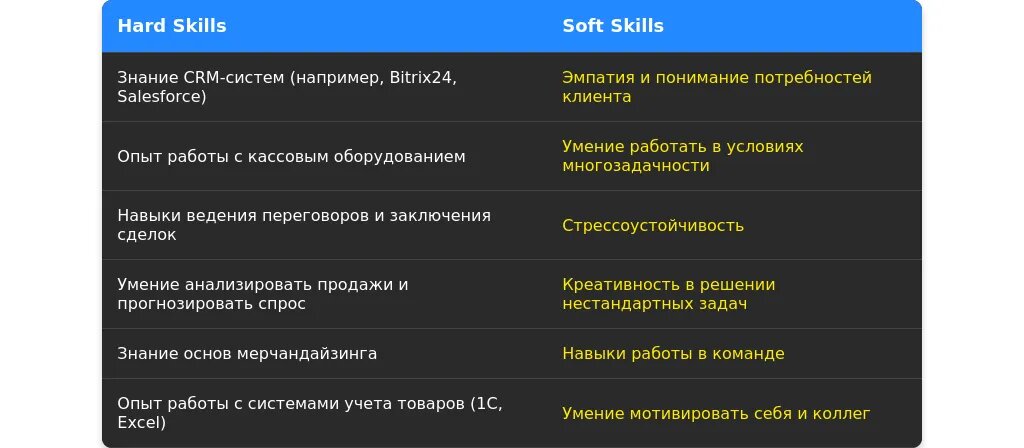 После адаптации: "Навыки продаж электроники, работа с кассой, знание CRM-систем, стрессоустойчивость."