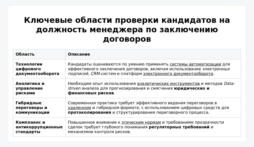 Личное собеседование с HR направлено на глубокую оценку ваших soft skills и конкретного опыта, который поможет вам успешно заключать договоры. На этом этапе основные области оценки включают: