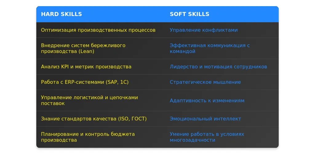 После адаптации: "Управление командами до 50 человек, оптимизация производственных процессов, знание SAP и 1С."