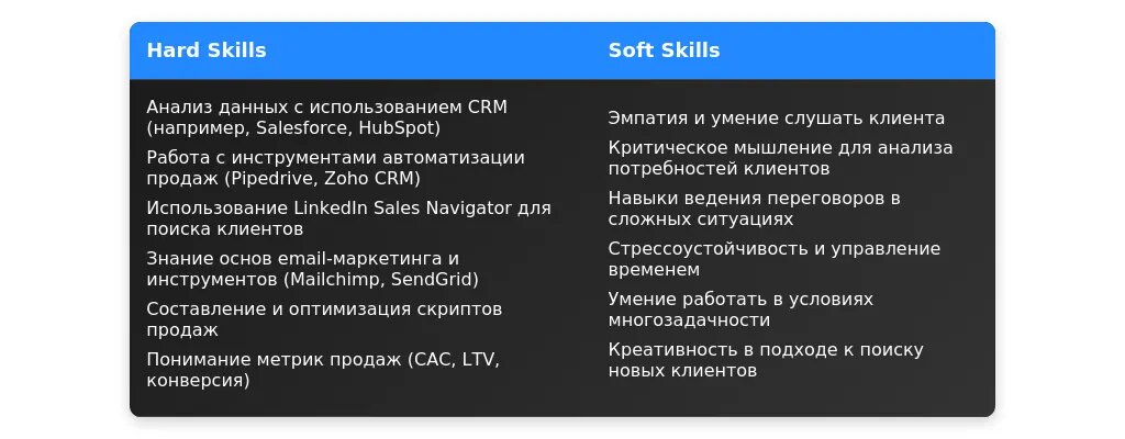 Навыки нужно перегруппировать так, чтобы они соответствовали требованиям вакансии. Например, если в вакансии указано, что требуется знание английского языка, переместите этот навык в начало списка. Выделите ключевые компетенции, такие как "работа с CRM-системами", "ведение переговоров", "поиск клиентов".